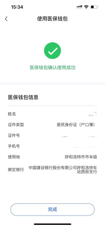 3. 使用医保钱包界面返回成功之后,点击完成显示如下。
