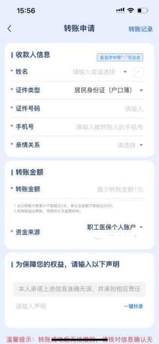 1. 每个医保钱包账户单日限额三笔转账,每笔转账金额不超过2000元,每日22:00-次日6:00不能进行转账。