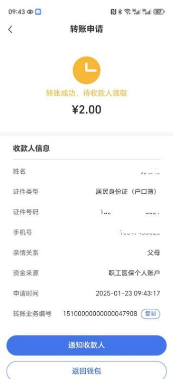 2. 授权人转账成功后,被转账人可在自己的医保钱包界面查询钱包余额及转账记录。