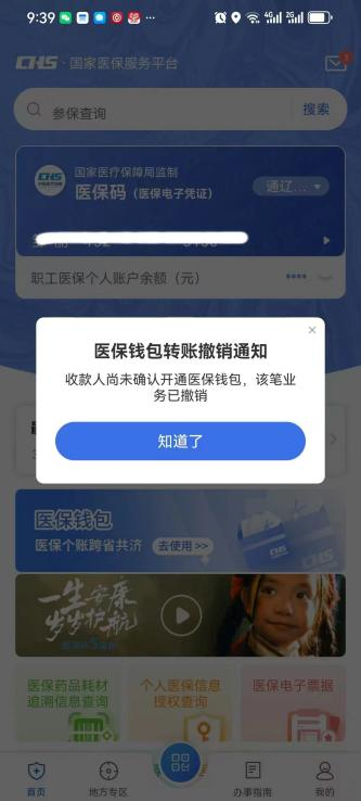 2. 医保钱包转账时,若被转账医保钱包账户未开立,则如下图所示。