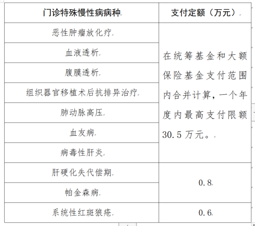 (二)门诊特殊慢性病在统筹基金和大额保险基金支付范围内合并计算,一个年度内最高支付限额30.5万元。